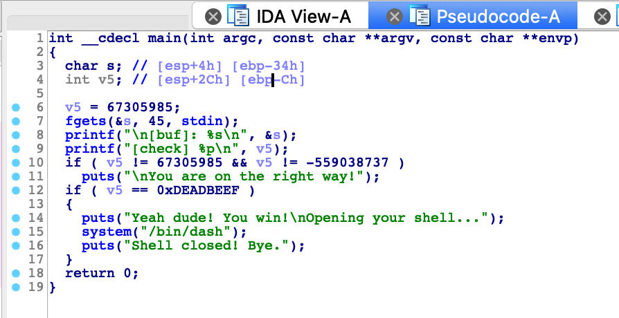 s의 버퍼크기를 알아서 모두 덮고, 그 뒤에있는 v5에 0xdeadbeef를 넣어주면 된다.