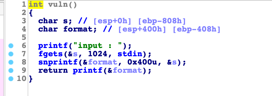 따라서 우리는 vuln함수의 printf(&format); 이 부분에서 printf.got 을 리턴으로 덮어주면 되니까