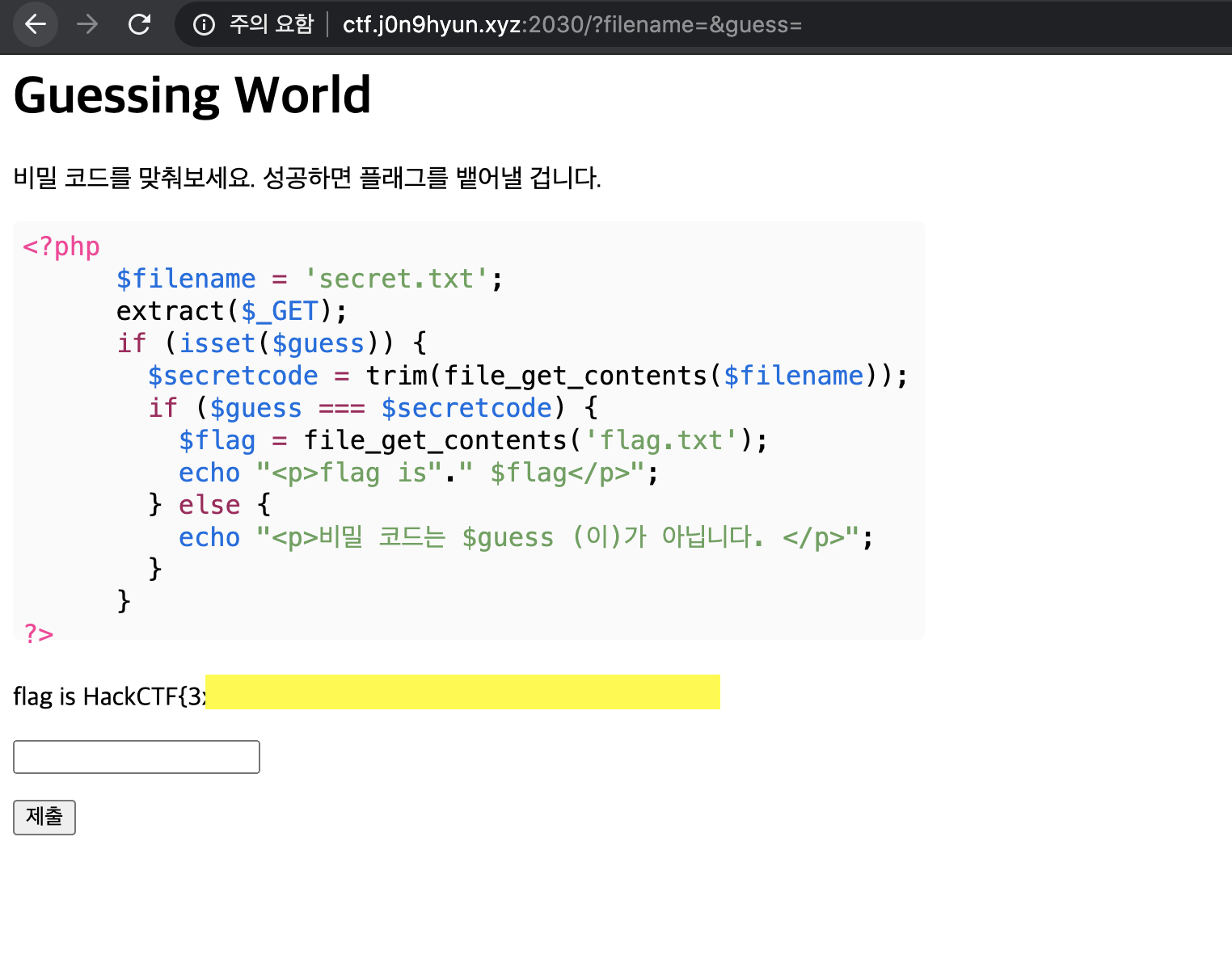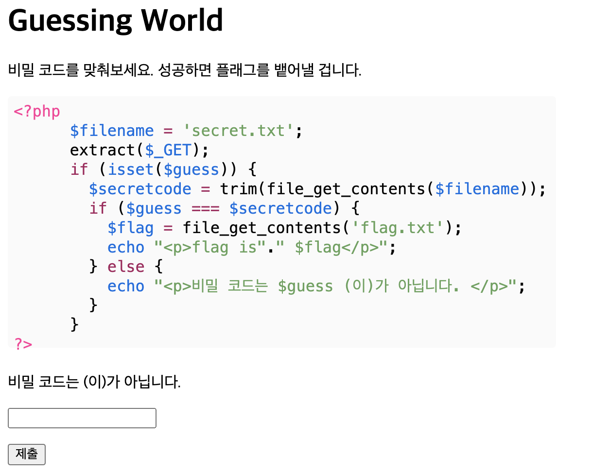 PHP코드를 분석해서 guess 와 secretcode 를 같게 해주면 될 것 같다.