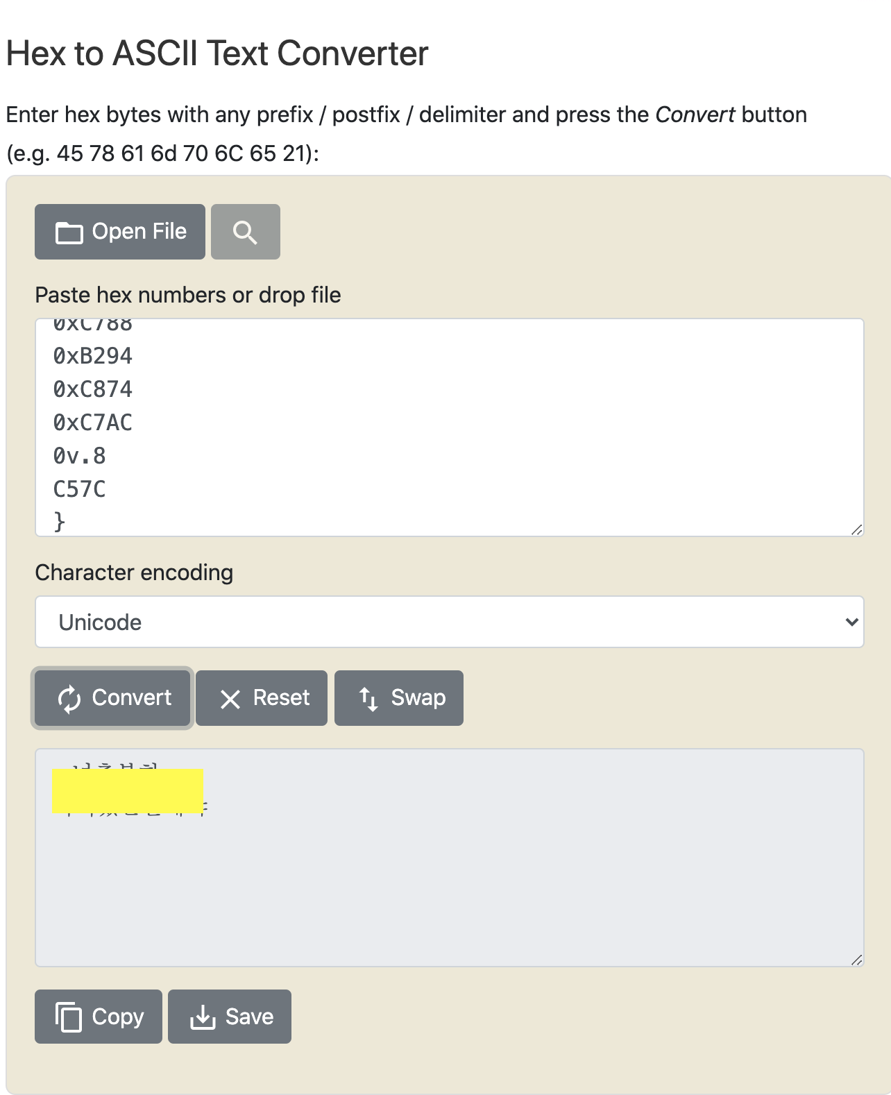 https://www.rapidtables.com/convert/number/hex-to-ascii.html페이지에서 한글로 변환이 가능하다