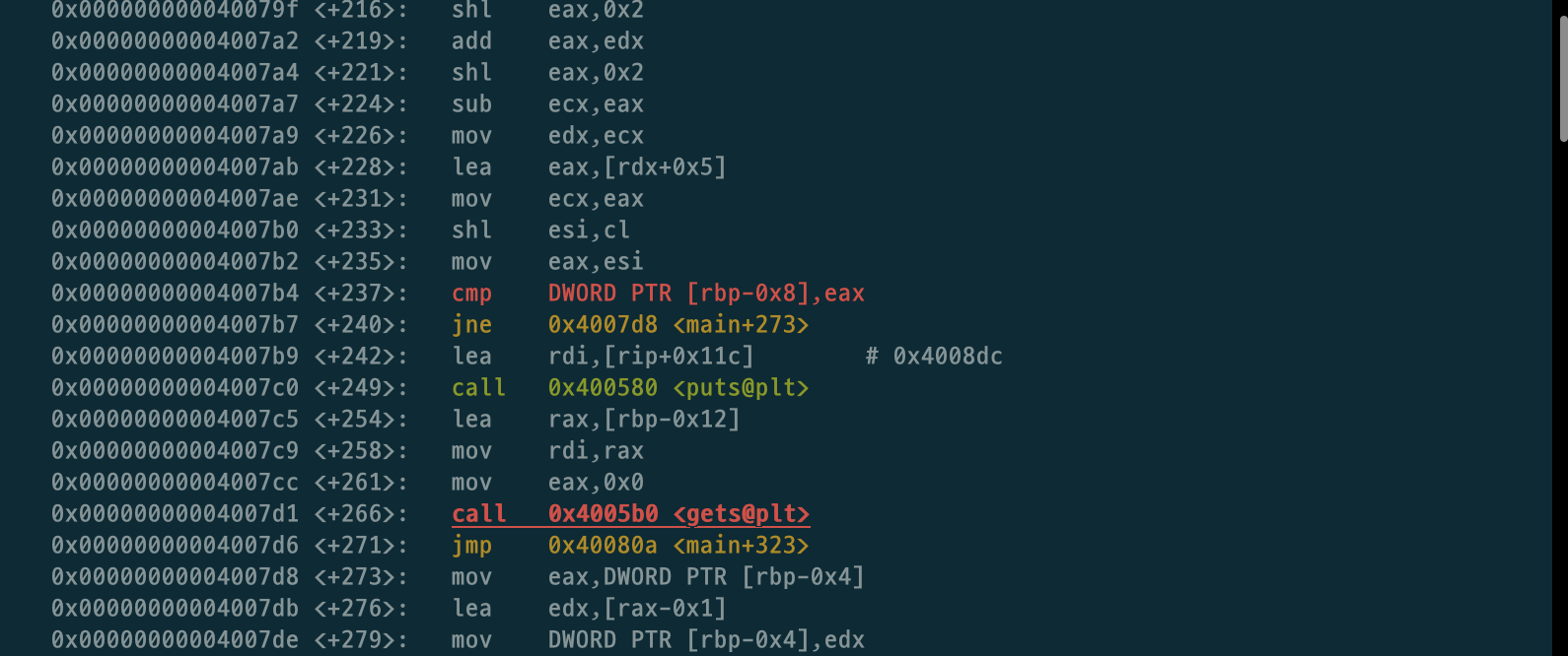 main+249하고 main+266에서 puts, gets를 call하는데 두개를 동시에 call하는 부분이 이 프로그램에선 저부분 밖에 없으니 main+237에 bp를 걸고 값을 확인해보겠다.
