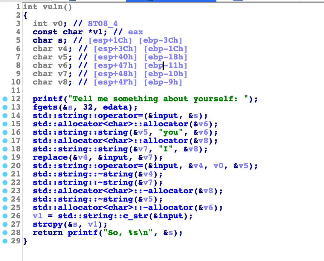 그럼에 16, 18, 19번째줄은 해석해보면 "I" 라는 문자를 "you"라는 문자로 바꾸어주기 때문에 이부분을 이용하면 bof를 해서 ret변조가 가능할 것 같습니다.