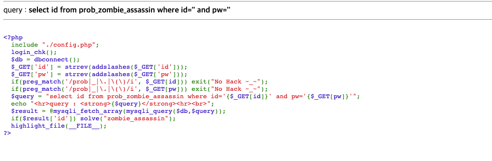 query :select id from prob_zombie_assassin where id='"\' and pw=''