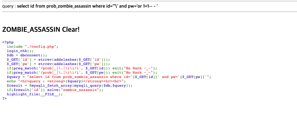 query :select id from prob_zombie_assassin where id='"\' and pw=''
