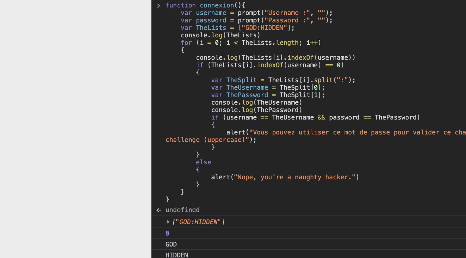 alert("Vous pouvez utiliser ce mot de passe pour valider ce challenge (en majuscules) / You can use this password to validate this challenge (uppercase)");