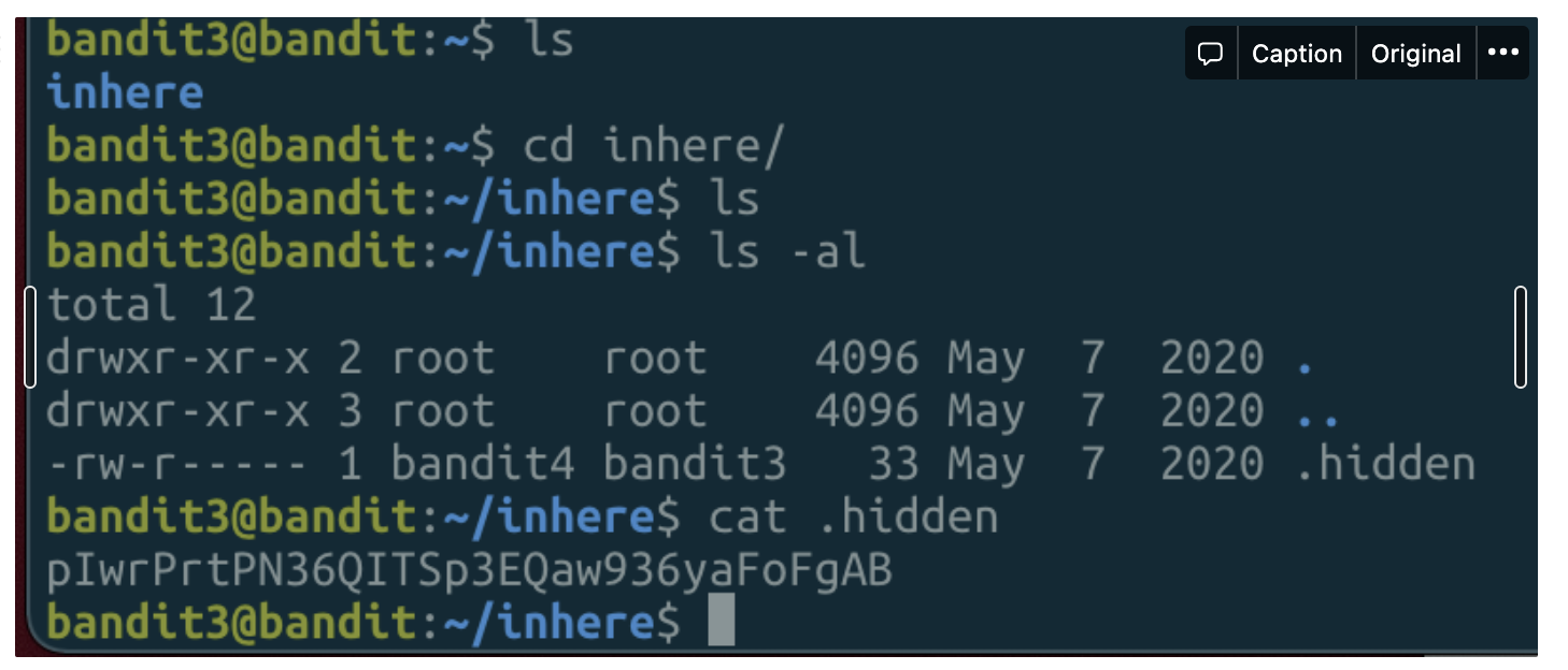 - ssh bandit3@bandit.labs.overthewire.org -p 2220