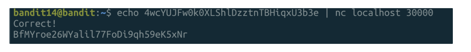 - echo 4wcYUJFw0k0XLShlDzztnTBHiqxU3b3e | nc localhost 30000