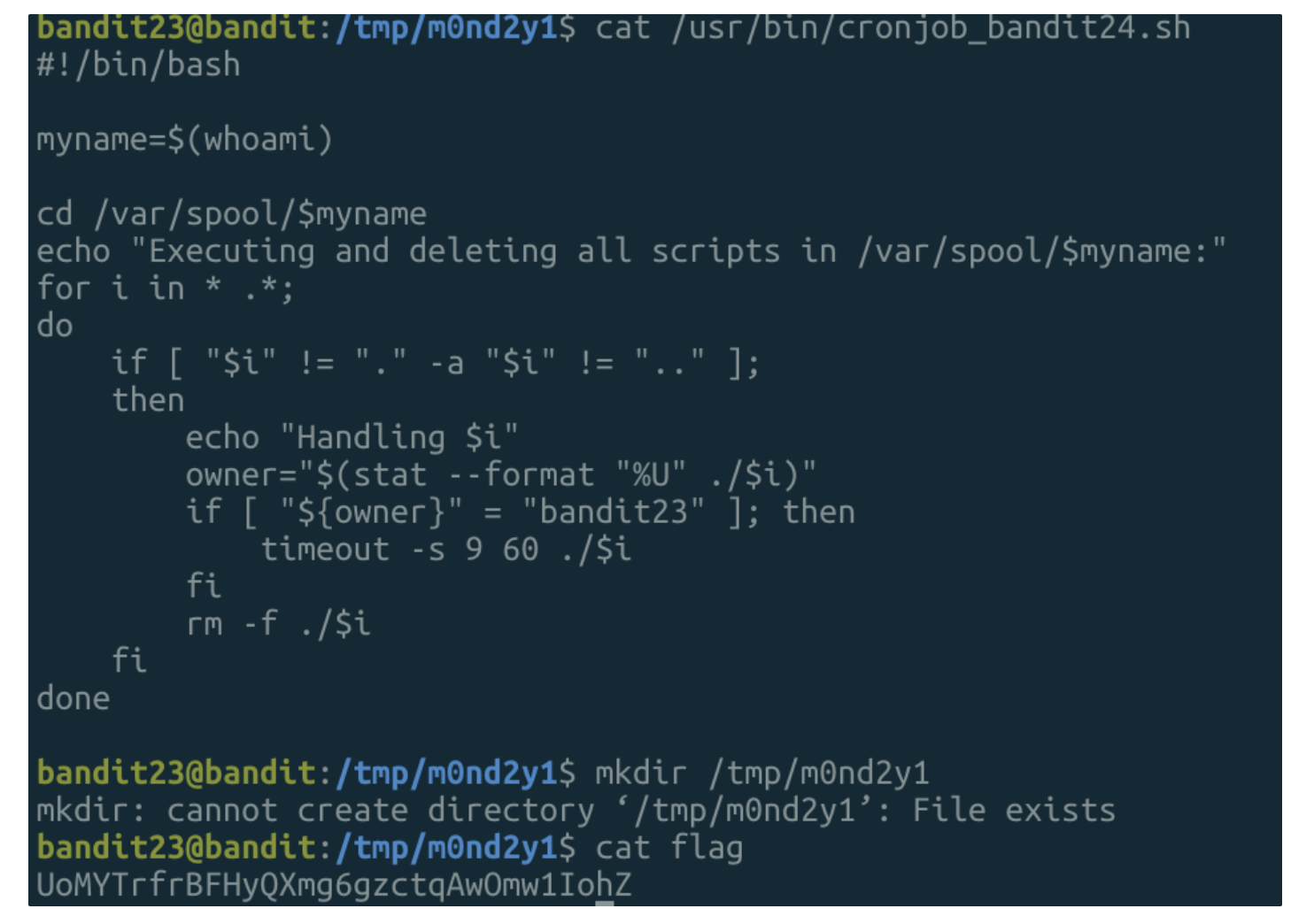 - cat /etc/bandit_pass/bandit24 > /tmp/m0nd2y1/flag