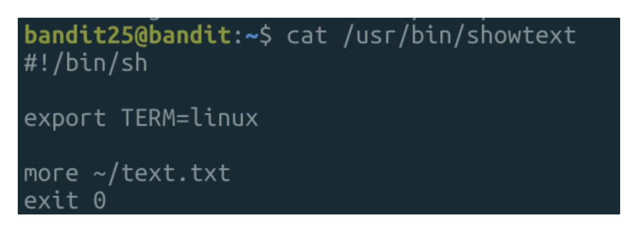 - ssh bandit25@bandit.labs.overthewire.org -p 2220