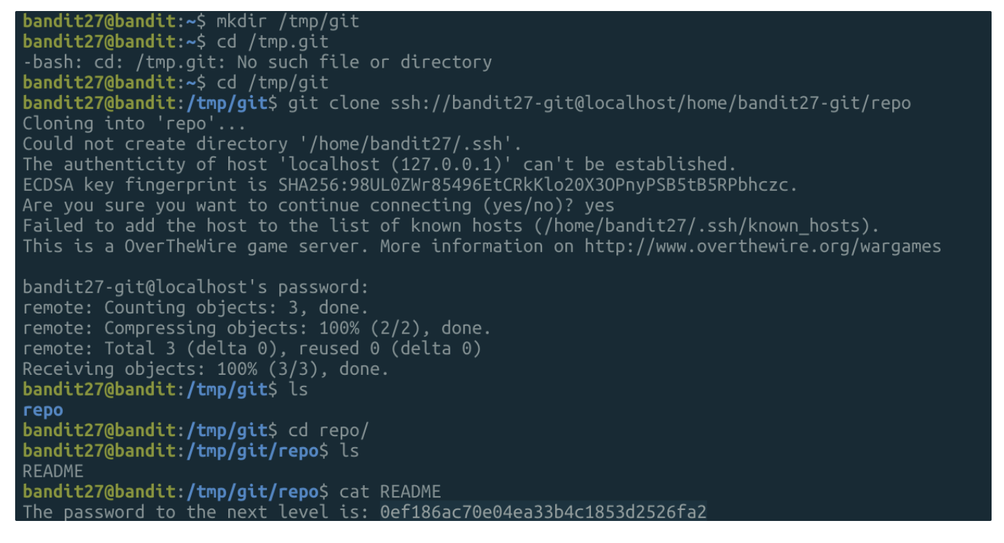 - git clone ssh://bandit27-git@localhost/home/bandit27-git/repo