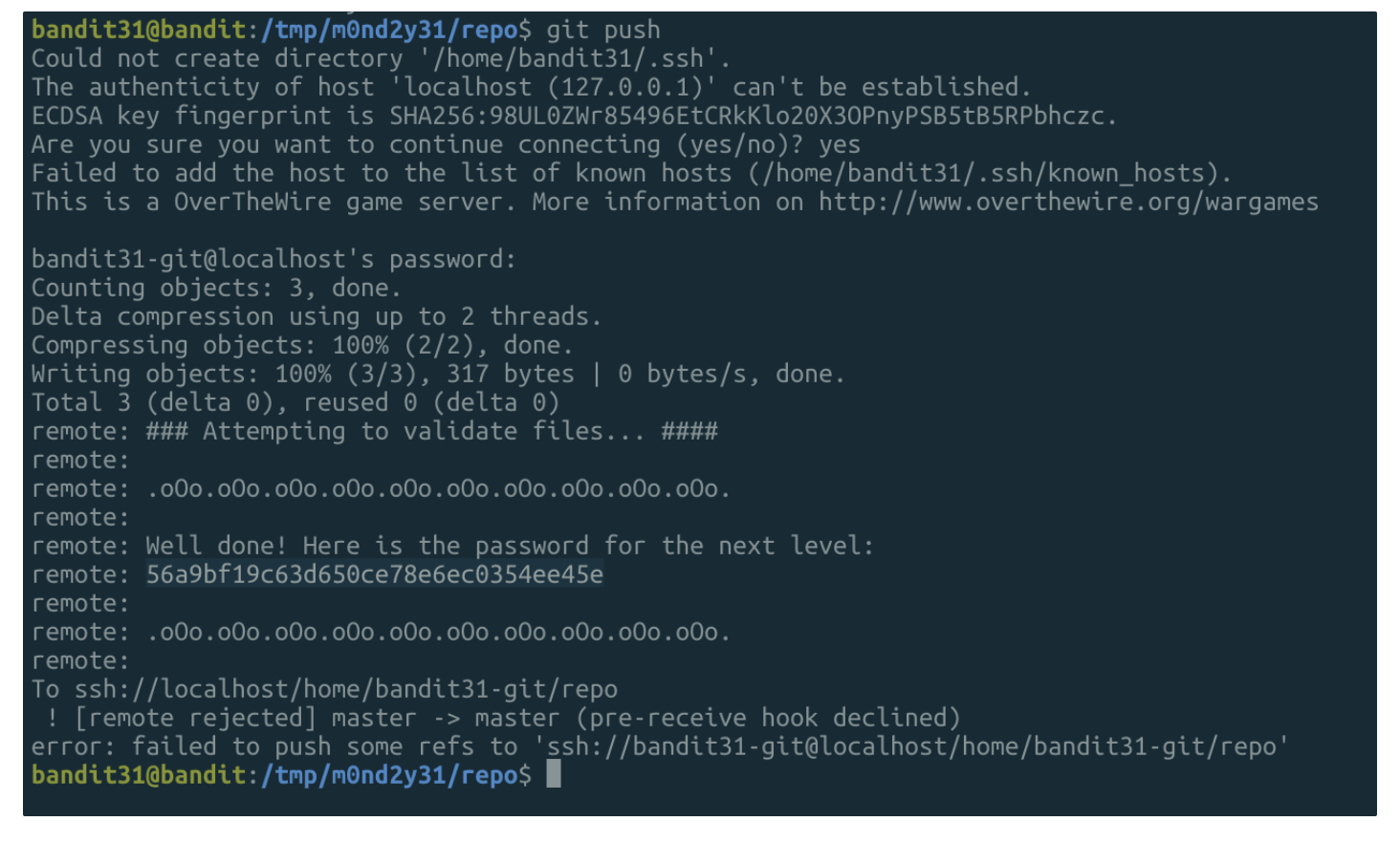 - git clone ssh://bandit31-git@localhost/home/bandit31-git/repo