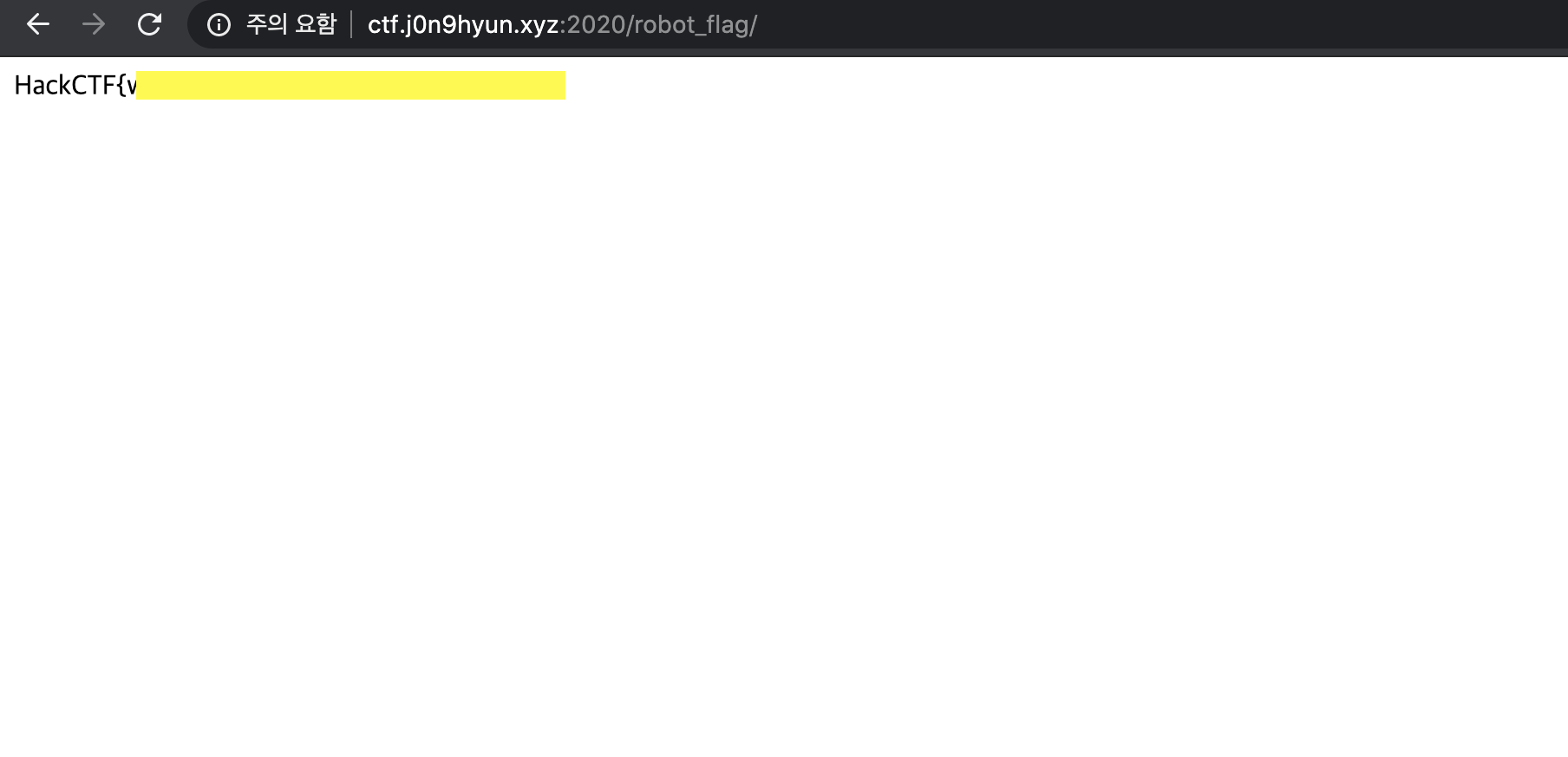 보통 robots.txt에 플래그가 들어있는데 들어가보니 /robot_flag/ 로 들어가라 해서 들어가보면