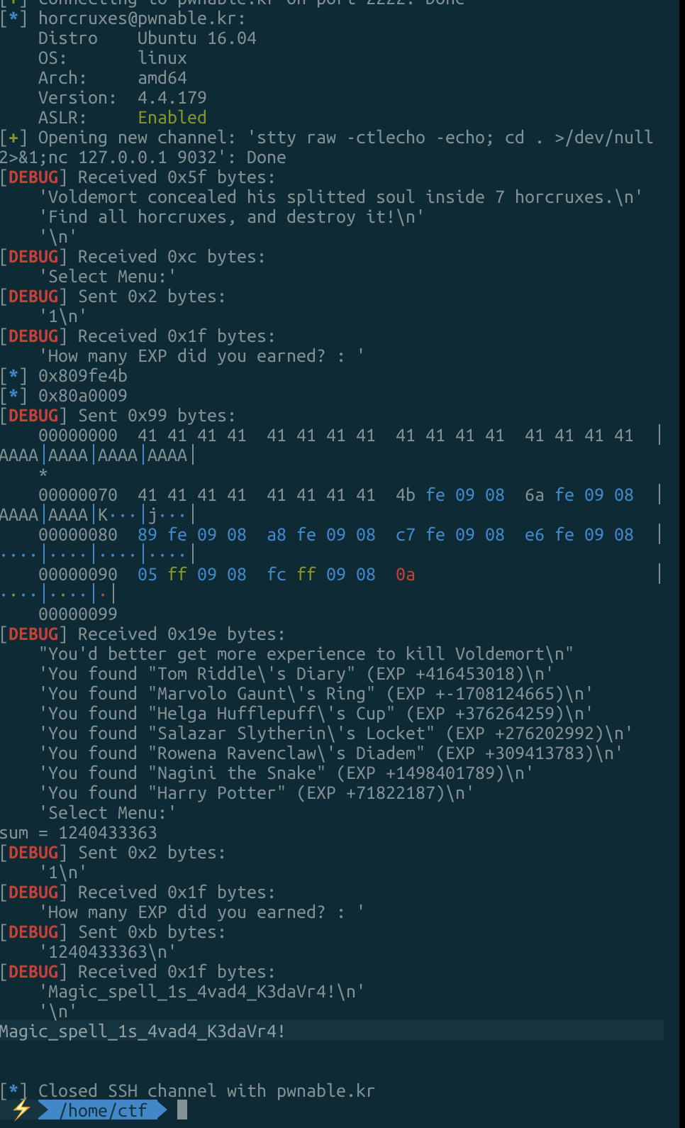 horcruxes.recvuntil('EXP +')